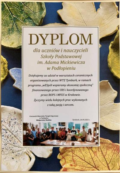 Uczniowie i nauczyciele naszej szkoły otrzymali dyplomy za uczestnictwo w warsztatach ceramicznych organizowanych przez WTZ w Tymbarku. Zapraszamy do zapoznania się ze szczegółami wystawy prac, które powstały podczas warsztatów - informacje znajdują się na plakacie poniżej.