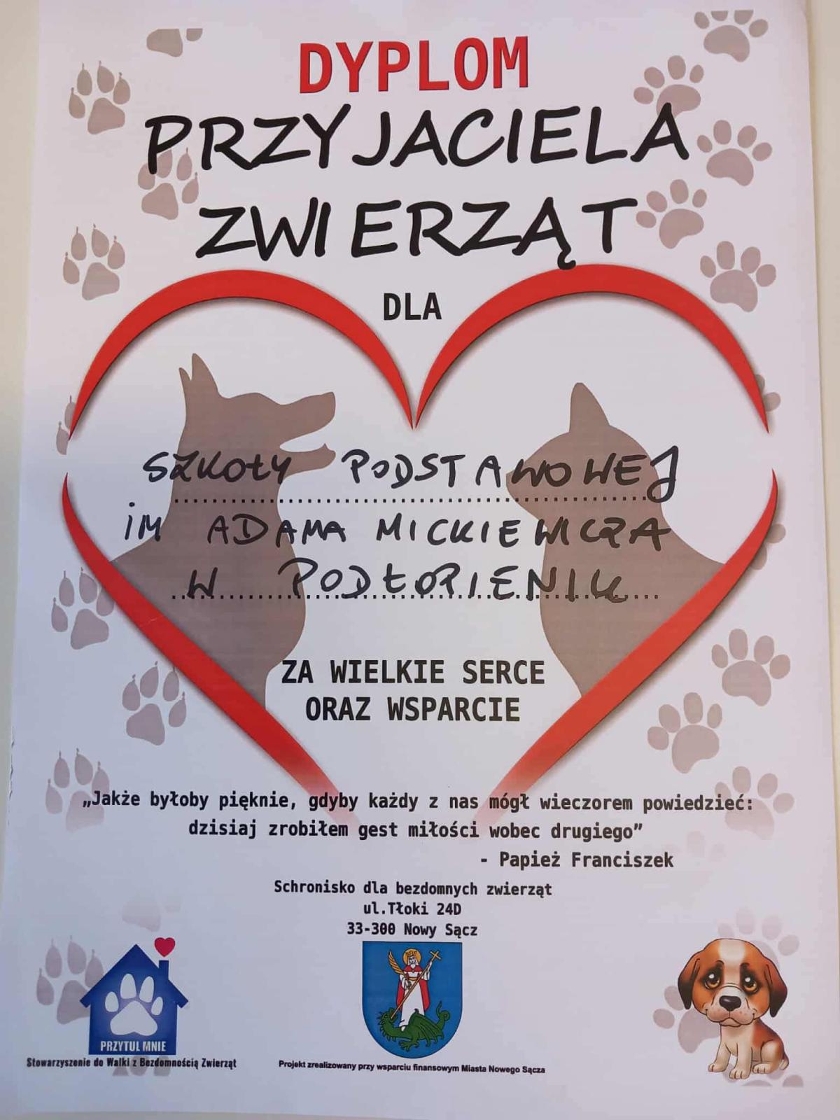 W związku z wspomnianym dniem, przez cały październik w naszej szkole trwała zbiórka materiałów (jedzenie, zabawki, koce itp.) dla podopiecznych Schroniska w Nowym Sączu pod hasłem „Wspomóż psiaka lub kociaka”. Celem akcji było kształtowanie u dzieci nawyku odpowiedzialności i wrażliwości na los zwierząt oraz poprawa standardu pobytu zwierząt w schronisku.