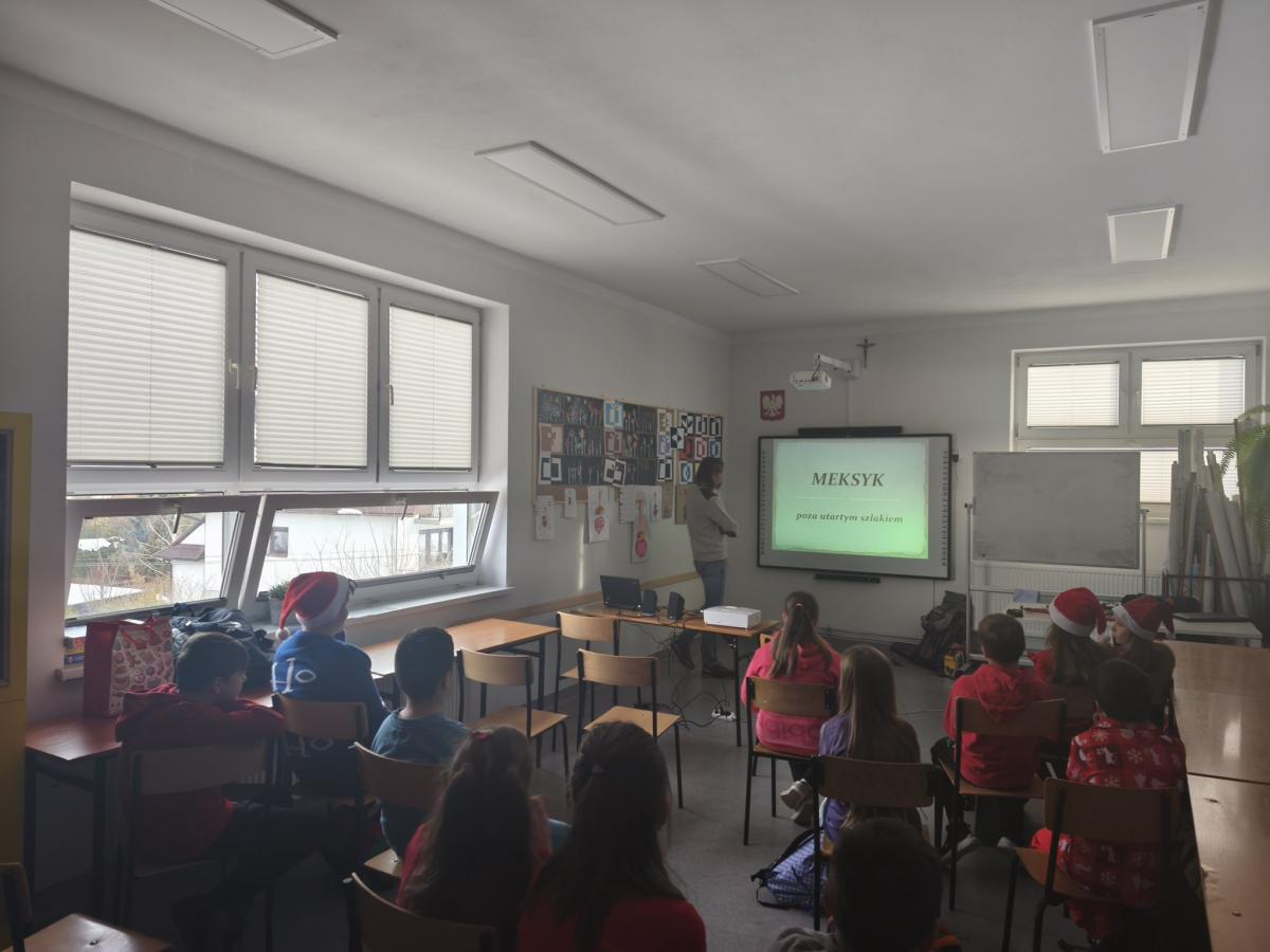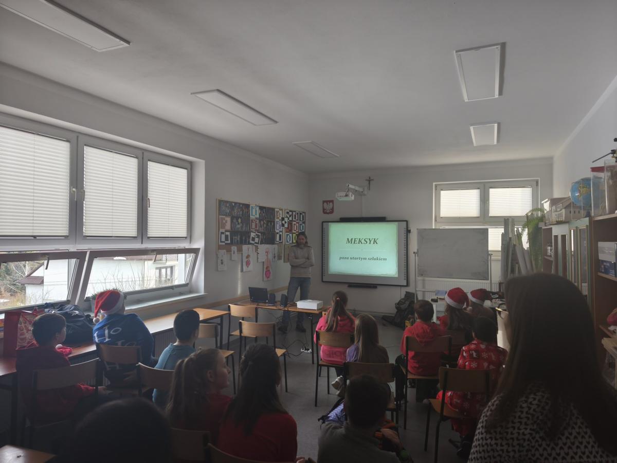 W piątek 5 grudnia uczniowie naszej szkoły wzięli udział w spotkaniu z podróżnikiem, który zabrał ich w niezwykłą podróż przez najciekawsze regiony Meksyku. Opowiedział o wędrówkach przez monumentalne kaniony Barranca del Cobre, dzikie pasma górskie Cumbres de Monterrey, Wulkany Kordyliery Wulkanicznej, o eksploracji pustynnych krajobrazów Sonory, oraz o wyprawie na niezwykły Półwysep Kalifornijski.